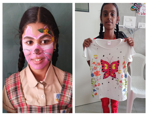 Activity 1 - Mosaic Masters-Art and Drawing club Class: 8 Description Both T-shirt and face painting activities foster creativity and self-expression that involve different materials and preparation processes for safety and durability. Here for T-shirt painting children used fabric paints, while face painting uses water-based, skin-safe paints for temporary designs. In essence, art makes children more imaginative, empathetic, and well-rounded individuals, preparing them for academic success and a fulfilled life. Craft work provides an outlet for emotional expression and can improve social skills through group projects.